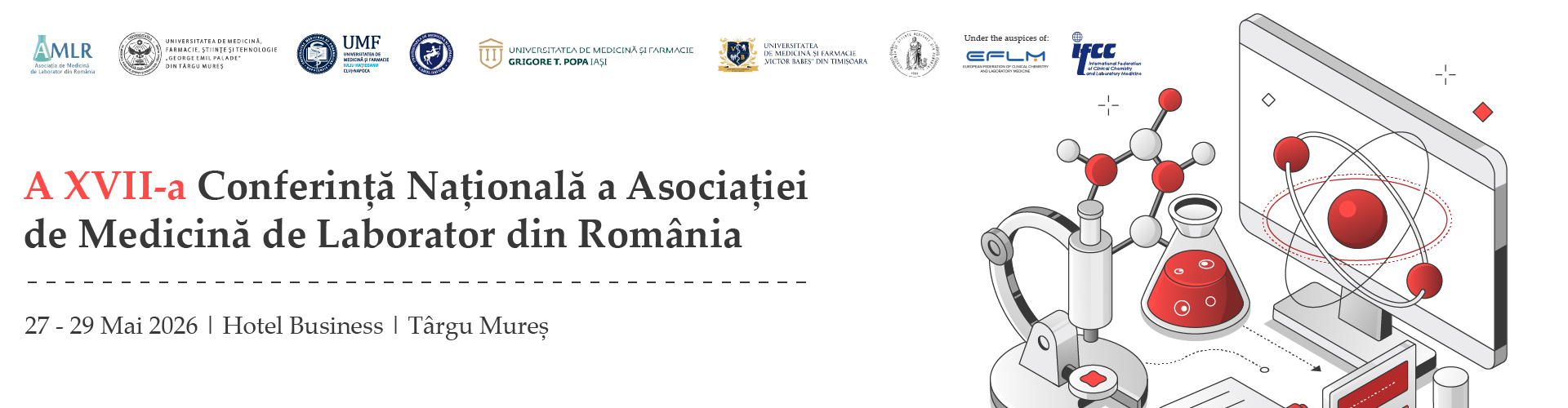 Vă așteptăm cu drag să luați parte la cea de-A 17-a Conferință Națională a Asociației de Medicină de Laborator din România, ce va avea loc la Hotel Business din Târgu Mureș, în perioada 27-29 Mai 2026.